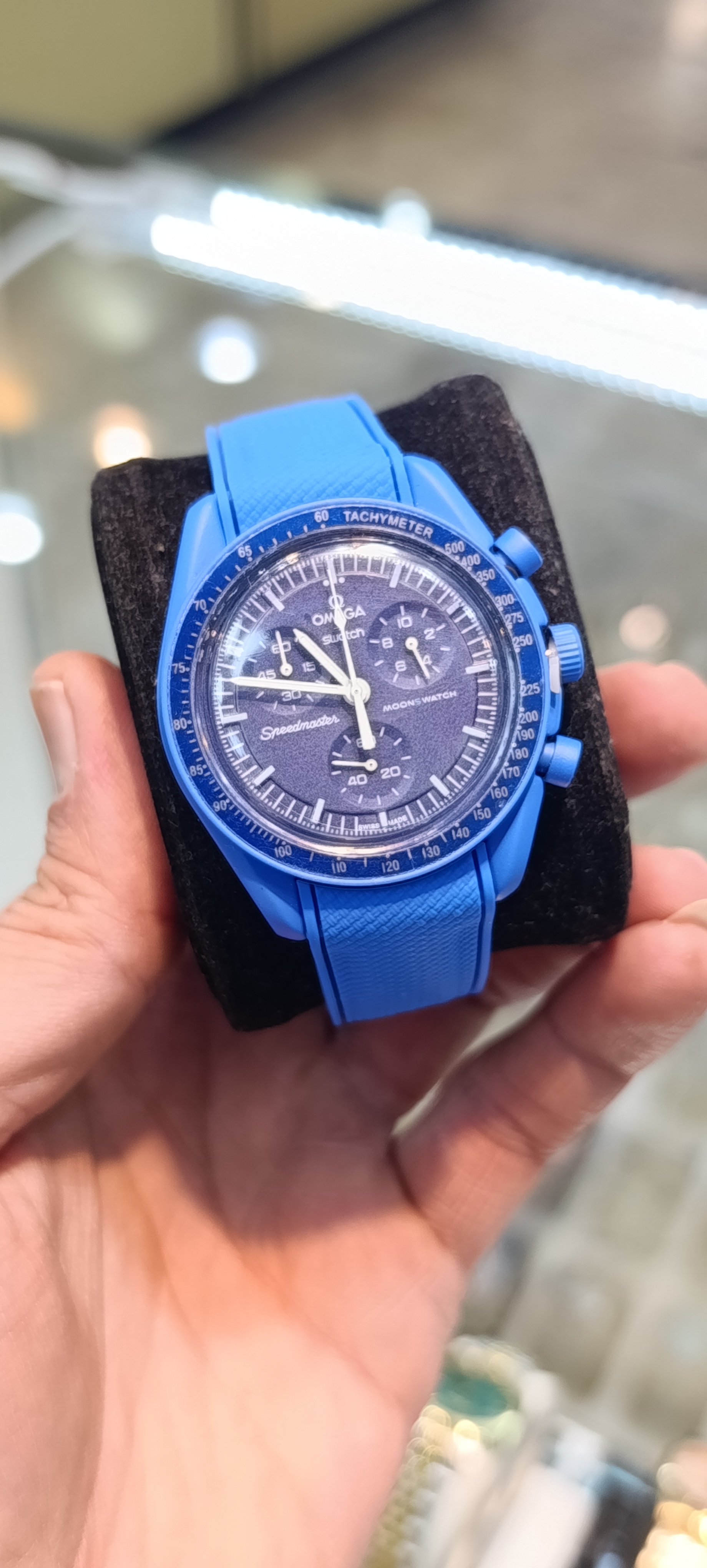 برند امگا سواچ موتور اپسون میوتا ژاپن قاب فلزی روکش رزین بند رابر و بند چسبی موتور کرنوگراف روانگرد دارای مون فیس 24ساعته